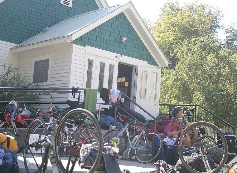 Bike & Build cyclists take a break on the steps of United Methodist Church, Paradise, Saturday afternoon after a long day of riding. The church hosted the group of 30 and provided to them food and shelter for the night.