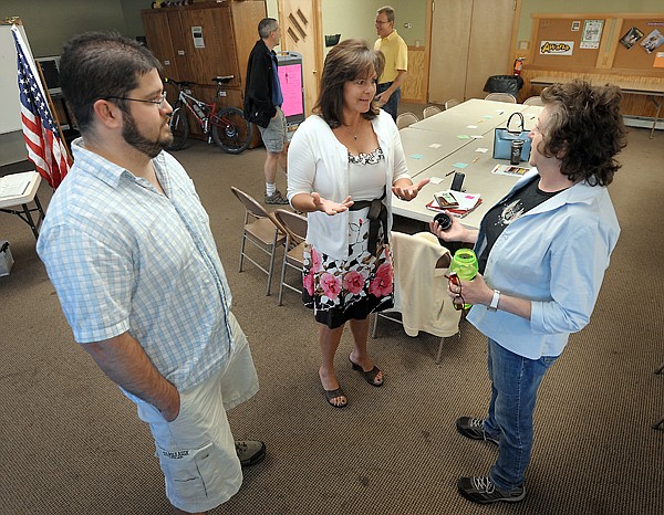 From left, Kyle Allred of KBA Web Marketing, Mishelle Johnson of Insty-Prints and Jill Evans of Send Out Cards chat together at the start of the BNI weekly meeting on Thursday, August 16, in Whitefish. In the background are Ry Keller, left, of Valley Maintenance and Property Management and David Boye of Black Diamond Mortgage Corporation.