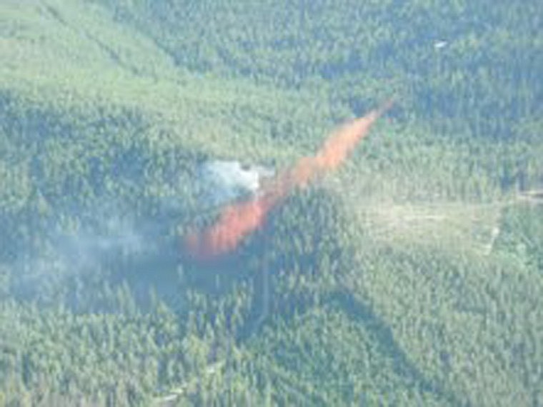 The SEAT (single engine air tanker) pours orange fire suppressant on the Charlie Miller Fire, located just outside of Superior.