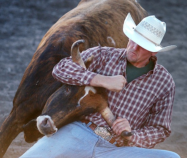 None of the 14 cowboys entered in the steer wrestling competition were able to post times under the 4.8-second mark set by Mike Gollaher on Thursday. Ross Mosher was the closest, pinning his steer to the dirt in 5.7 seconds. Reigning Montana Circuit champion Ty Erickson had a chance to beat Gollaher’s time after grabbing onto his steer a third of the way down the arena, but the steer wriggled out of his grip.