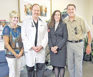 A reception for two of St. John’s Lutheran Hospital doctors on Wednesday was held at the hospital. In the photo above, Marketing Director KC Hoyer, left, stand swith Drs. Raymond Zurcher, Nicole Benz and Brad Black. Zurcher, who is certified in emergency medicine, and Benz, who specializes in internal medicine, are the two latest additions. Dr. Black is nationally known for his expertise in treating patients with asbestosis. The reception was held in the Leigh Lake Room, just inside the hospital’s main entrance.
