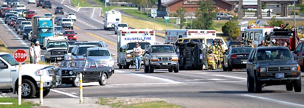 An early view of a rollover accident on Highway 93, at the intersection of Four Mile Drive, on Monday, August 20, in Kalispell. Traffic was backed up along the highway in both directions. North bound was back up to south of Kalispell Regional Medical Center.