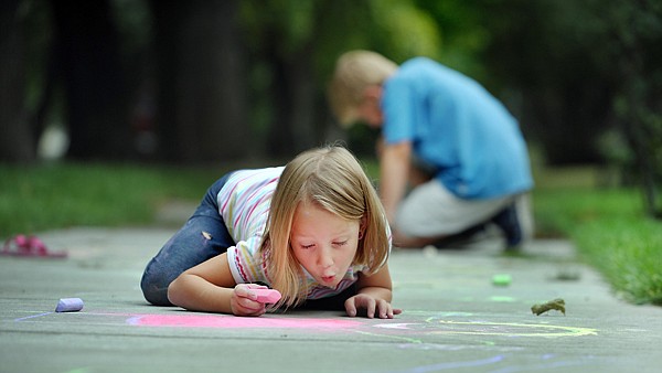 Danaka Felton, 5, of Helena, works on a chalk drawing with her grandmother's neighbor, Simon Hill, 10, of Kalispell, on Tuesday afternoon, August 21.