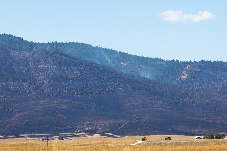 Smoke rises Wednesday afternoon from a charred hill side where The West Garceau fire burned west of Polson Wednesday, Aug. 22, 2012 in Polson, Montana.