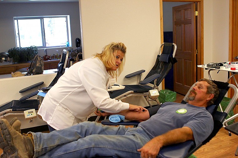 Charlie Moser, a member of the Lewiston Idaho American Red Cross team, prepares Jim Lommen of Superior for his blood donation during a blood drive on Thursday.