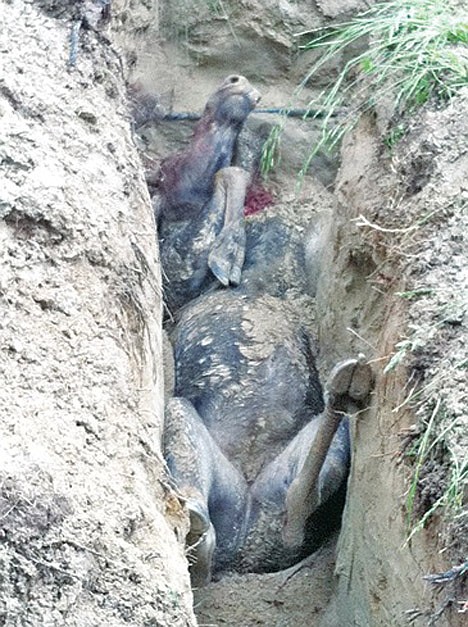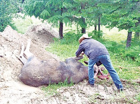 When he was found in the water line trench on Russ and Kathy Wilson's property on Bull Lake Road, it took several hours for excavators to get the wedged animal out.