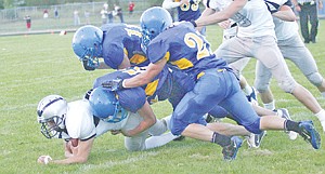 QB Christian Trocke tackled by Josh Bowers, center, Skyler Higareda, right and Bryce Gustin, second quarter.
