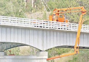 Montana Department of Transportation Bridge Inspector Kurt Maart, lower, left at end of boom in bucket, gives the Kootenai River Bridge its bi-annual inspection on Wednesday afternoon.