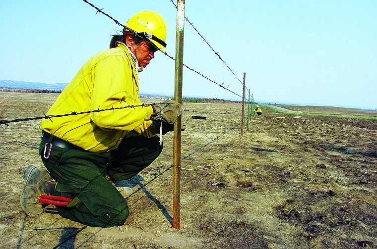 With burned range land stretching into the distance, Lee Carlson tightens a barbed wire fence damaged by a wildfire on the Northern Cheyenne Indian Reservation in this Aug. 9 photograph. A horse escaped through the fence earlier in the day. It's been an especially brutal fire season for the 4,500 person tribe living in a remote, arid region in eastern Wildfires have burned more than 90 square miles on the reservation since June.