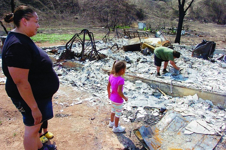 LuAnna Fox and her 3-year-old daughter Kamille watch her 10-year-old son Sheldon look for salvageable items from the ruins of the family’s house on the Northern Cheyenne Indian Reservation in this Aug. 9 photograph.