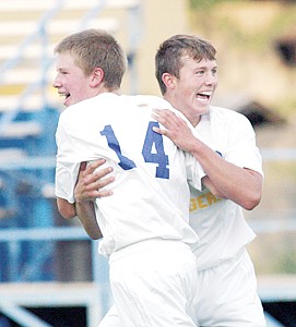 Freshman midfielder Zander Peterson, 14, congratulates a jubilant Jason Schnackenberg after the latter scored his hat trick against Stevensville.