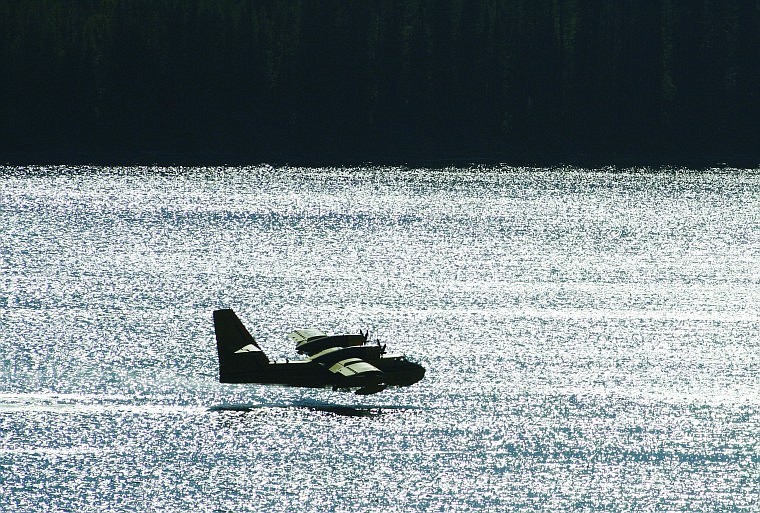 A “Super Scooper” plane flies low over the south end of Hungry Horse Reservoir Thursday as part of the firefighting effort on the Dart Creek Fire in the Bob Marshall Wilderness. The Canadair CL-215 planes skim over the surface of the reservoir, pick up a load of water through special vents, then fly to the fire.
