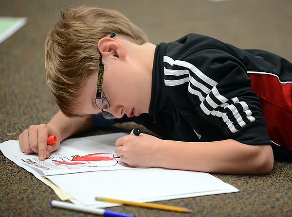 Keller Mitchell colors in an outline of a heart on Friday, November 30, at Kalispell Montessori School.