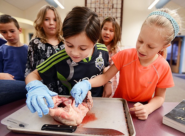 From left, Jake Ritzdorf, Gretta Wisher, Maya Lacey, Grace Coen and Ellie Hawes take a closer look at a cow's heart on Nov. 30 at Kalispell Montessori Elementary School.