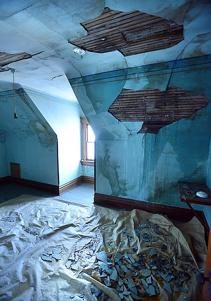 The 7,982-square-foot mansion is sorely in need of a new roof, and extensive water damage on the second and third floors would make restoration a costly challenge.