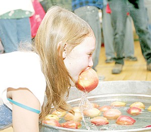 Abbiegale King, 9, emerges a winner Saturday evening in the apple bobbing contest.