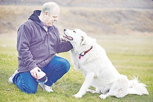 Brenda Ahearn/Daily Inter Lake David Marion with Ace, one of the Great Pyrenees from the film Santa Paws2: The Santa Pups, on Wednesday, November 28, at A Country Animal Hospital in Eureka. Ace is now 16 months old and weighs 125 pounds. According to Marion, he's still growing.
