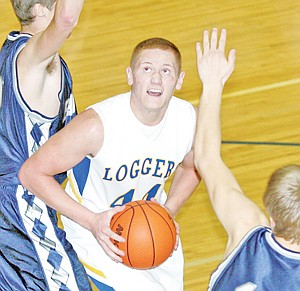 Kraig “Coppertop” Nelson, senior center, looks to post up in heavy traffic in the third quarter. Nelson had 10 points and threw his weight around in the close contest.