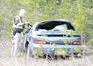 MHP Bryce Ford checks the seat belt in Thursday's one car rollover at the 3.2 mile marker on Pipe Creek Road.