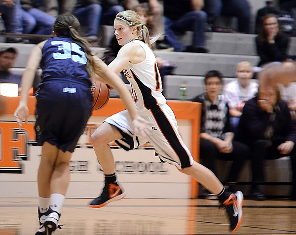 Flathead junior Emma Andrews (10) makes a run for the basket during the game against Great Falls on Saturday, December 8, in Kalispell. Flathead lost the game 47-56.