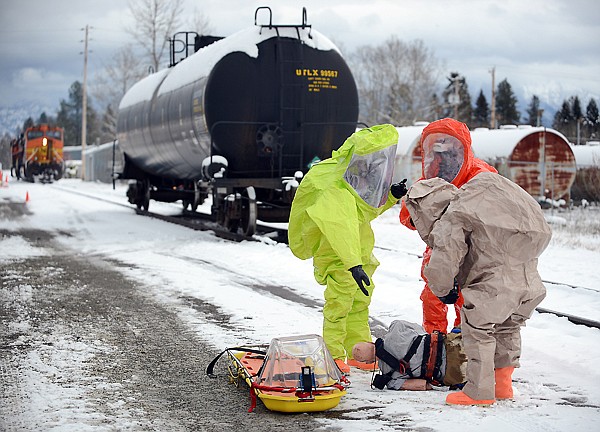 Members of the Kalispell Fire Department Hazmat Team and the Army National Guard 83rd Community Support Team out of Helena arrive on the scene of a mock toxic spill on Tuesday, December 11, in Whitefish. Several agencies joined forces for Tuesday's drill including the Flathead County Office of Emergency Services, the Whitefish, Columbia Falls and Kalispell Fire Departments, the Whitefish Police, the Flathead County Sheriff's Department and many others.
