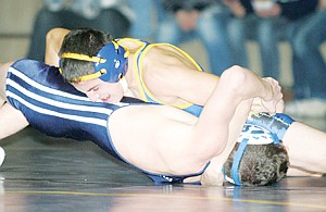 Michael Ayala pins Bonners Ferry’s Jared Coogan at 125. Ayala pinned Coogan in a minute, 20 seconds for six points. The Loggers cruised to a 61-24 victory over the Badgers.