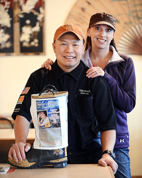 Tien and Maureen Windauer with one of the boots they used in raising funds for Taylor Peterson on Friday, December 7, at Tien's Place in Columbia Falls.