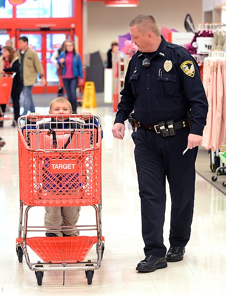 Patrolman Mike Johnson walks alongside Gabe Melvin 5, on Wednesday, December 12, at Target in Kalispell as part of the Shop with a Cop program.