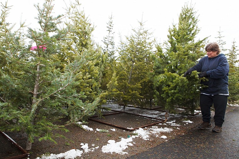 Patrick Cote/Daily Inter Lake Diane Robinson adjust a tree Saturday afternoon at the Robinson Tree Farm tree lot in Evergreen. Saturday, Dec. 15, 2012 in Evergreen., Montana.