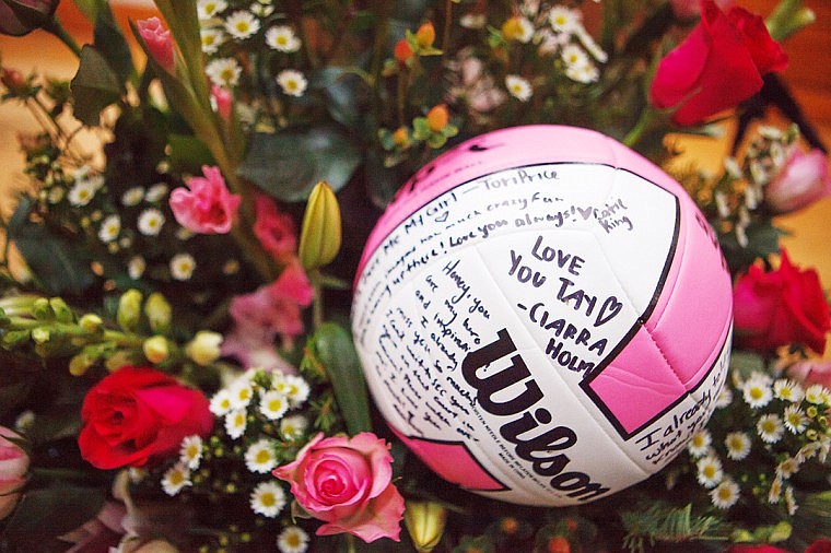 Patrick Cote/Daily Inter Lake A volleyball signed by friends and teammates on display Sunday afternoon during a celebration of life ceremony for Taylor Peterson at Columbia Falls High School Sunday, Dec. 16, 2012 in Columbia Falls, Montana.