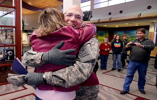 Psc. Collin Wunderlich of Kalispell, a member of the Army National Guard, gets a hug from his mother Paula Wunderlich on Monday afternoon, December 18, as he arrives home from Advanced Individual Training in Va. Wunderlich left the Flathead in August for Basic Training at Fort Leonard Wood, Mo. He then went straight on to AIT. When he returns to AIT he will still have six weeks before he finishes and will then be stationed in Kalispell.