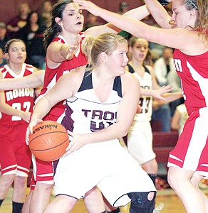 Senior Breanna Opland all hemmed in under the basket looking to pass first quarter vs. Noxon.