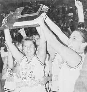Seniors Christy Konzen and Tracee Hanson and their teammates hold up the first place trophy at the state Class B tournament in Lewistown. Greg Van Tighem photo from the Dec. 9, 1992, files of The Western News.