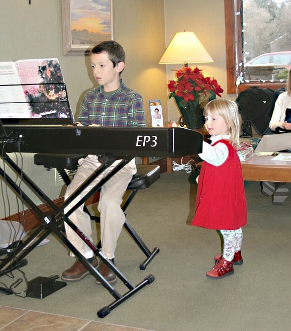 Martin Wrobleski plays the piano while his little sister Katherine observes him.