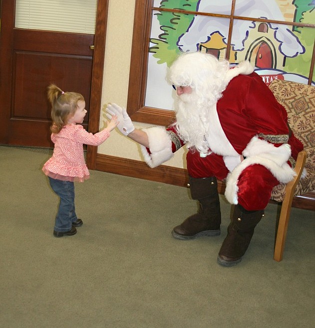 Cooper Spurr hesitantly gives Santa Claus a high five.