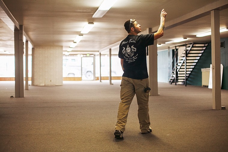 Patrick Cote/Daily Inter Lake Malachi Roybal points out repairs that need to be made Wednesday afternoon at the Kelly Main Building in downtown Kalispell. Wednesday, Dec. 19, 2012 in Kalispell, Montana.