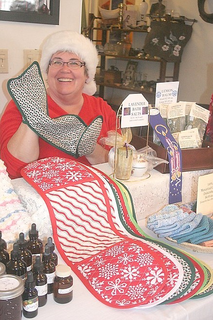 Bernadette Hall holds up one of her handmade "Amazing Pot Holders" at the Christmas at the Symes holiday bazaar. Hall makes just 30 pot holders each year for the event.