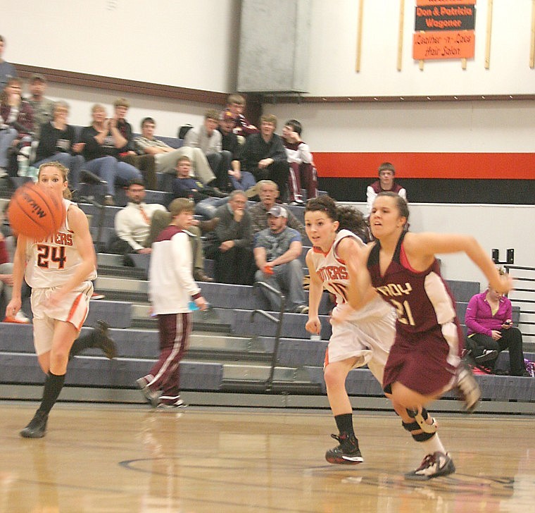 Felicia Earhart and a Lady Trojan race to get the ball after a turnover Friday night.