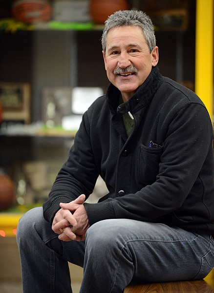 Former Whitefish basketball coach Julio Delgado sits in front of the trophy cases at Whitefish High School on Wednesday, December 12.