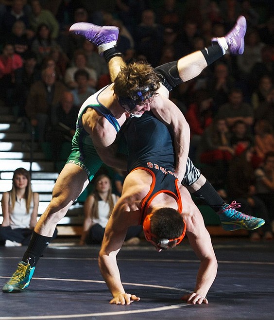 Patrick Cote/Daily Inter Lake Glacier's Grant Tafoya (left) takes down Flathead's Jake Shaffer during the 171-pound match Thursday evening during the Crosstown wrestling dual at Glacier High School. Thursday, Dec. 20, 2012 in Kalispell, Montana.