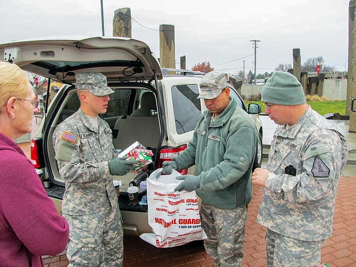 MOSES LAKE - Moses Lake National Guard unit members stood in Sinkiuse Square Saturday morning with a stack of presents.