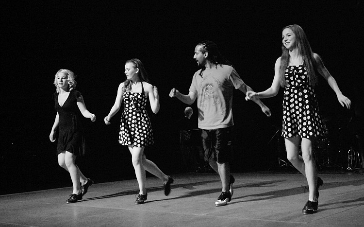 Perrey Sobba, left, Bridget Unterreiner, professional dancer Aaron Tolson and Marlow Schulz dance together. The three girls, all dancers with Feat x Feet, were chosen to perform in a tap show at the Kennedy Center in Washington, D.C.