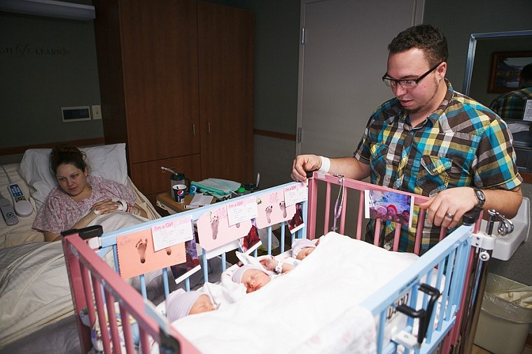 Patrick Cote/Daily Inter Lake Graham Cook looks over his new-born triplets Friday afternoon at Kalispell Regional Medical Center. Friday, Dec. 28, 2012 in Kalispell, Montana.