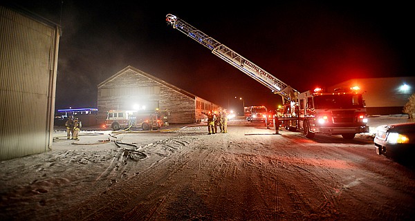 Firefighters from Kalispell, Evergreen and Whitefish respond to a call out for a structure fire at Northwest Drywall on Thursday evening near 11 p.m. in Kalispell. The fire was under control by midnight. Members of the Kalispell Police and the Flathead County Sheriff's Department were also on site.