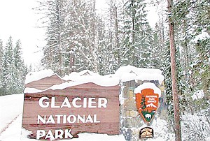 Snow covers the entrance sign to Glacier National Park Dec. 11, 2012, in West Glacier, Mont. Glacier officials are concerned about the effects of oil and gas development on the Blackfeet Indian reservation, and are asking for an in-depth study on the environmental impacts. Blackfeet tribal officials say they are complying with all requirements before drilling and they bristle at the suggestion they can't develop their resources safely. (AP Photo/Matt Volz).