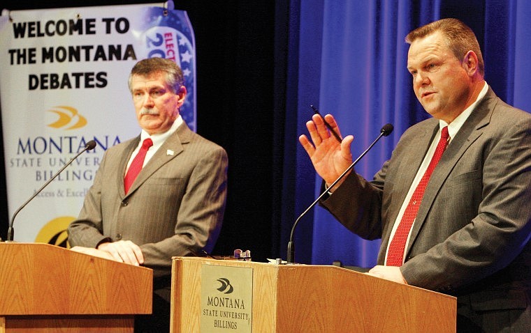 Sen. Jon Tester, right, speaks during a debate with Rep. Denny Rehberg on Oct. 8 in Billings. Tester won re-election in a hotly contested race.