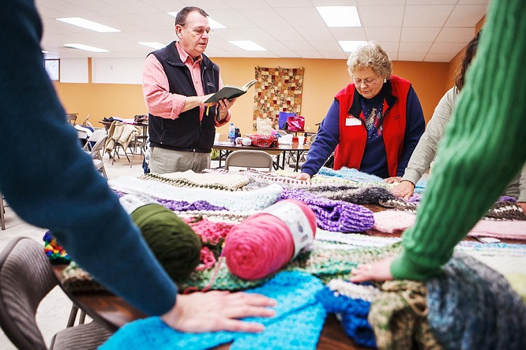 Prayer Shawl Ministry group members surround the table while retired pastor Tim Gopp reads a prayer Friday afternoon while blessing several scarves made during the “Hugs For Hope Stitch Out” at Bethany Lutheran Church in Bigfork. The Prayer Shawl Ministry group came together to make close to 50 scarves in the last week in tribute to the victims of the Connecticut school massacre. The scarves with be distributed to The Samaritan House, Veterans Food Pantry and various other organizations throughout the community.