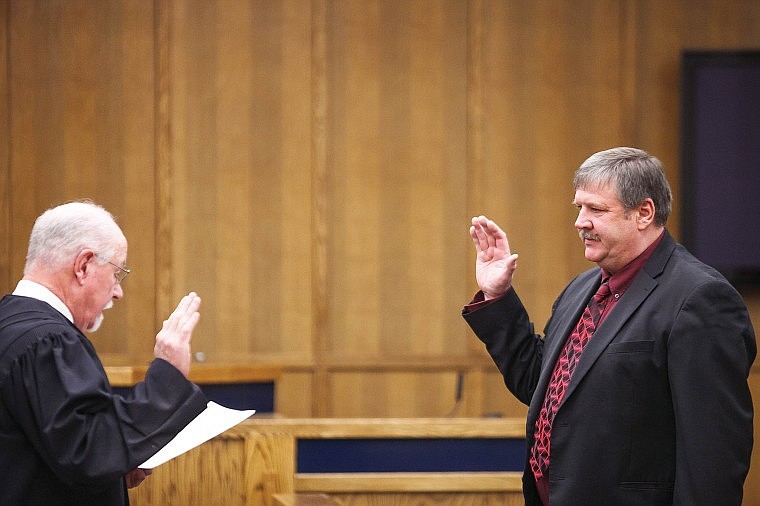 Judge Ted Lympus, left, swears in Gary Krueger as Flathead County commissioner Monday morning at the Flathead County Justice Center.