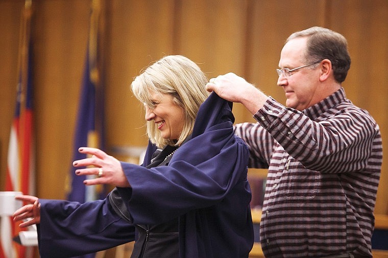 Brad Wright helps his wife, Heidi Ulbricht, into her new robe during her swearing-in ceremony Monday morning at the Flathead County Justice Center. Ulbricht succeeds Stewart Stadler as Flathead District Court judge.