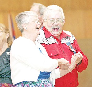 Spinning Squares' Deanna Kehn, left, and Flatheader Roger Jones of Kalispell enjoy an evening of square dancing at Kootenai Valley Christian School.